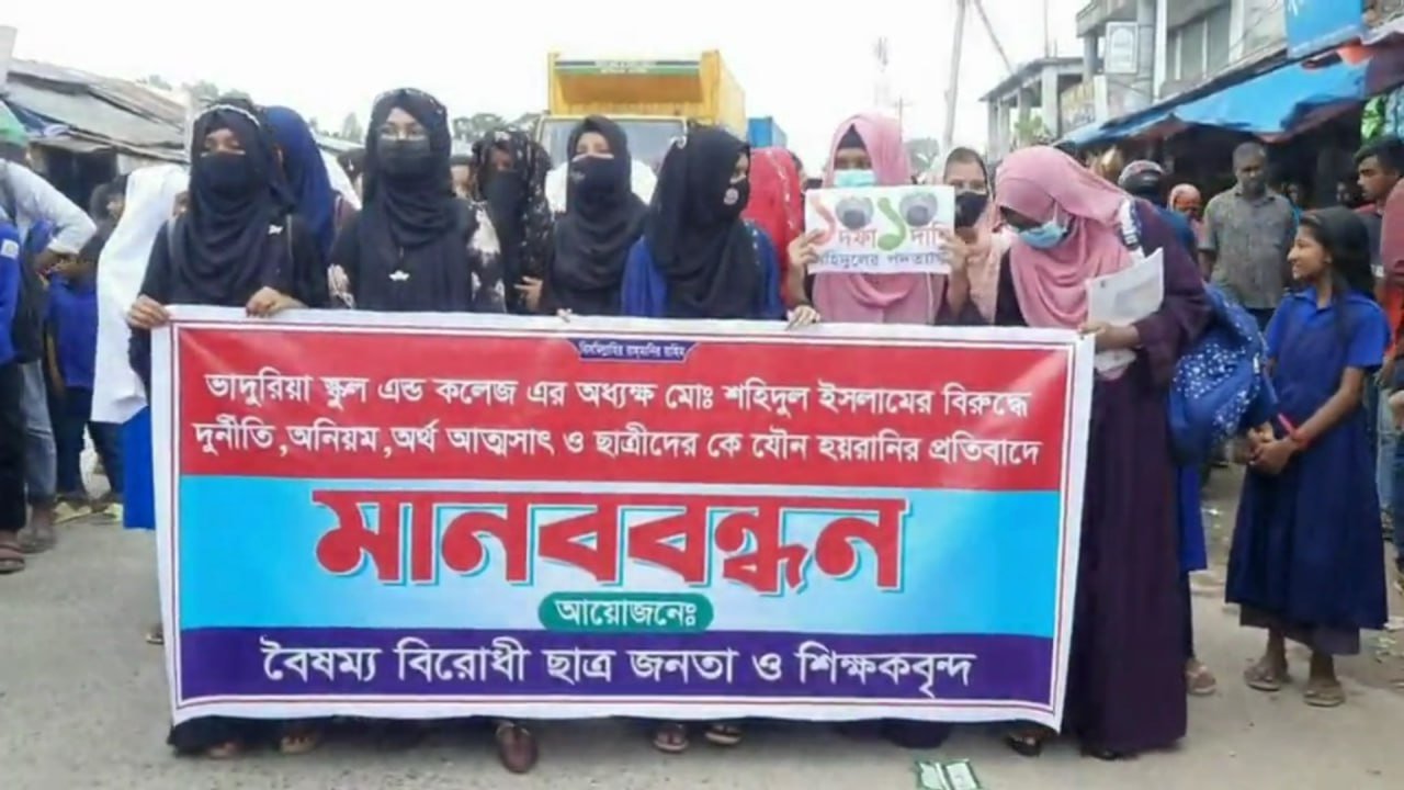 কৌশিক চৌধুরী, হিলি: দিনাজপুরের নবাবগঞ্জ উপজেলার ভাদুরিয়া স্কুল এন্ড কলেজের অধ্যক্ষ শহিদুল ইসলামের বিরুদ্ধে শিক্ষা প্রতিষ্ঠানের অর্থ আত্মসাৎ, নিয়োগ বাণিজ্য, শিক্ষক-কর্মচারীদের সাথে অসৌজন্যমূলক আচরণ, শিক্ষার্থীদের যৌন হয়রানিসহ নানা অভিযোগ এনে তার পদত্যাগের দাবিতে বিক্ষোভ মিছিল ও মানববন্ধন করেছে বৈষম্য বিরোধী ছাত্র আন্দোলনের শিক্ষার্থীরা।