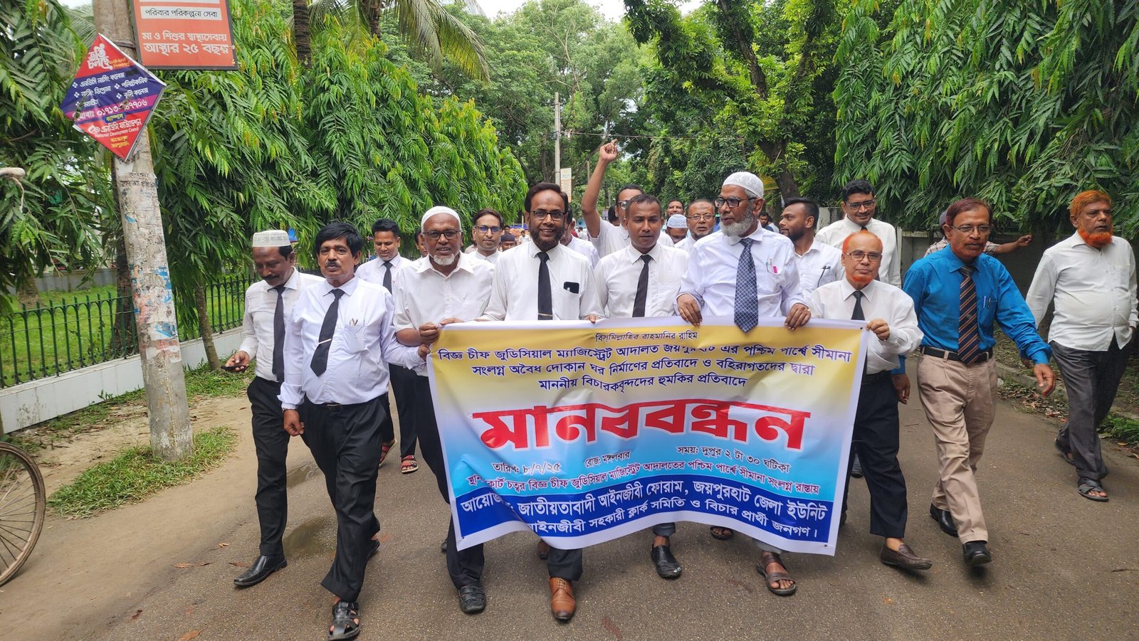 অবৈধ দোকান ঘর নির্মাণ ও বহিরাগত বিচারককে হুমকির প্রতিবাদে জয়পুরহাটে মানববন্ধন