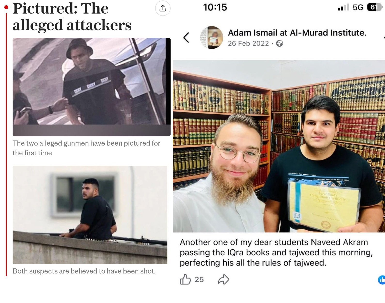 গত রোববার ২৪ বছর বয়সী নাভিদ আকরাম এবং তাঁর বাবা ৫০ বছর বয়সী সাজিদ আকরাম সিডনির জনপ্রিয় সমুদ্রসৈকত এলোপাতাড়ি গুলি ছোড়েন।