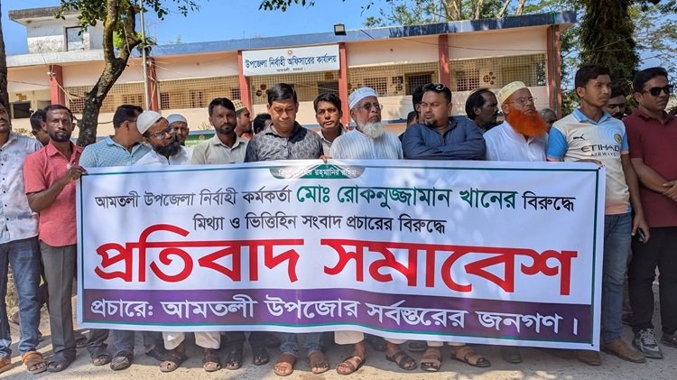 আবু জিহাদ, আমতলী(বরগুনা): বরগুনার আমতলী উপজেলা নির্বাহী কর্মকর্তা (ইউএনও) ও পৌর প্রশাসক মো. রোকনুজ্জামান খানের বিরুদ্ধে সামাজিক যোগাযোগ মাধ্যমে মিথ্যা ও বানোয়াট তথ্য প্রচারের প্রতিবাদে মানববন্ধন ও প্রতিবাদ সমাবেশ অনুষ্ঠিত হয়েছে।
