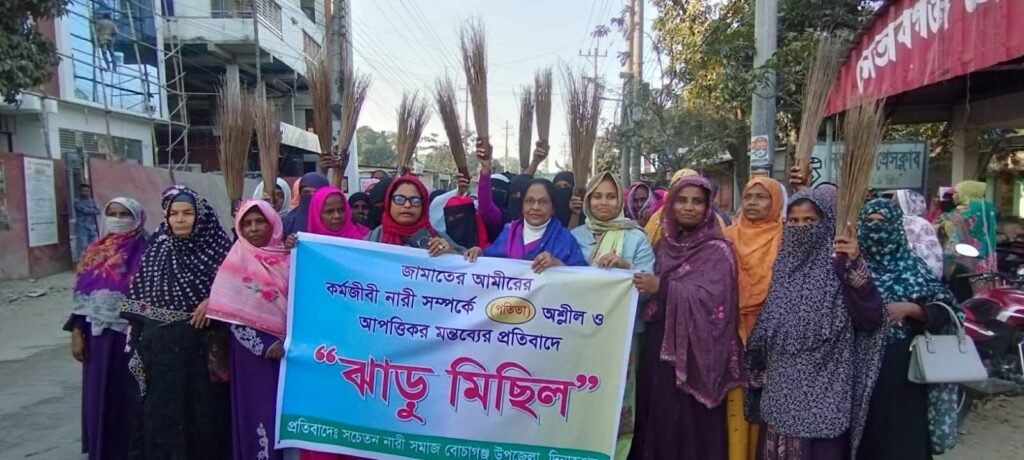 খাঁন মোঃ আঃ মজিদ, দিনাজপুর: কর্মজীবী নারীদের সম্পর্কে জামায়াতে ইসলামীর আমিরের অশ্লীল ও অবমাননাকর মন্তব্যের প্রতিবাদে দিনাজপুরের বোচাগঞ্জ উপজেলায় ঝাড়ু মিছিল করেছে সচেতন নারী সমাজ।