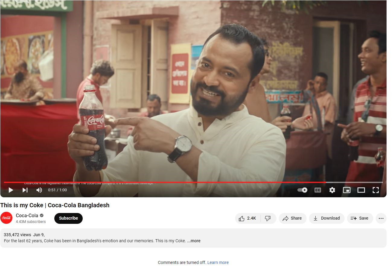কোকাকোলার ওই বিজ্ঞাপনে যাতে আর কেউ মন্তব্য করতে না পারেন, সেজন্য কমেন্ট বক্স বন্ধ রাখা হয়েছে। ছবি: ভিডিও থেকে নেয়া