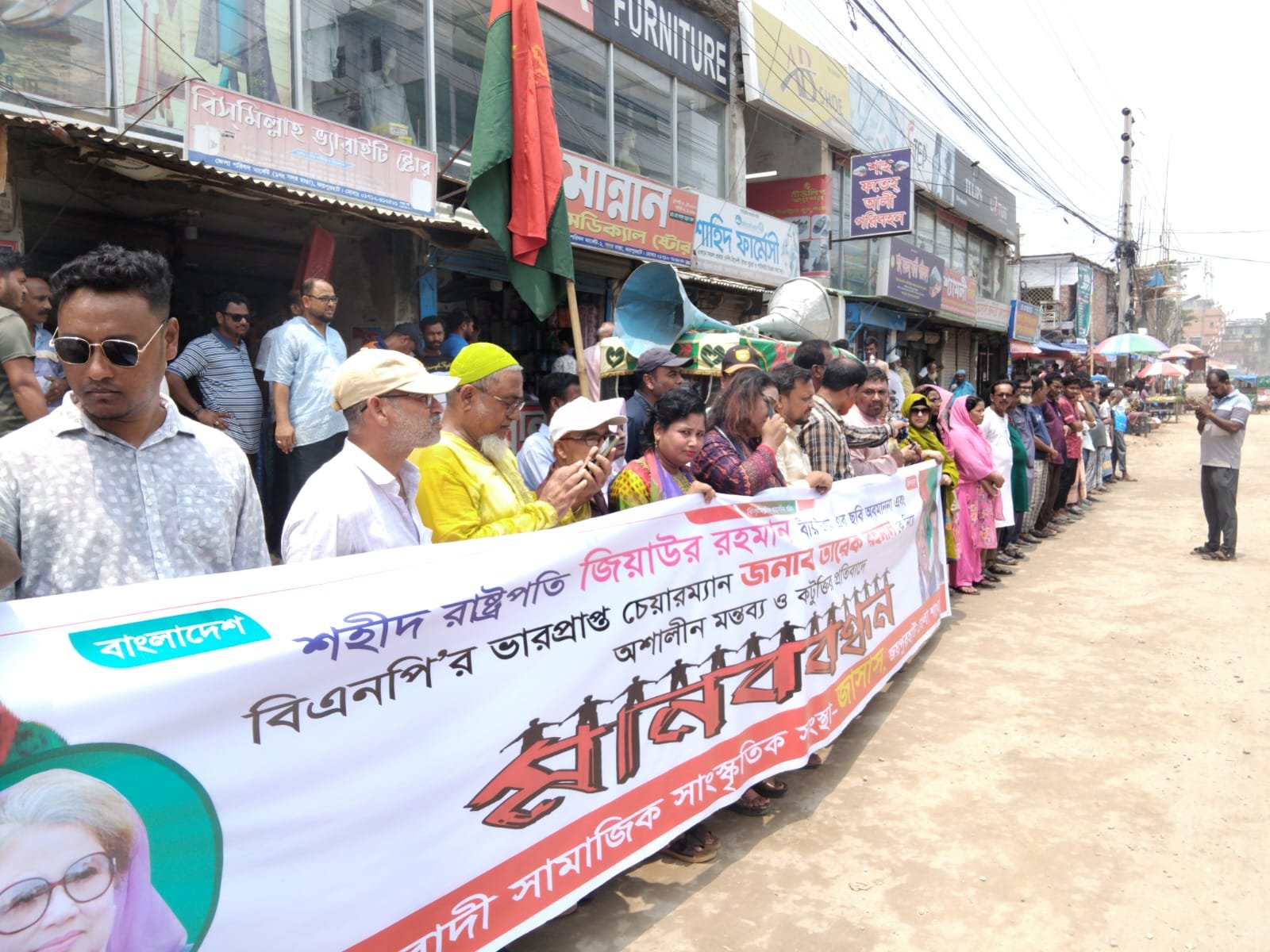 জেলা জাসাস সভাপতি মিনারুল ইসলামের সভাপতিত্বে মানববন্ধনে বক্তব্য রাখেন জেলা বিএনপির আহ্বায়ক গোলজার হোসেন, যুগ্ম আহ্বায়ক এম এ ওহাব, জেলা মহিলা দলের সভাপতি পারভীন বানু রুলি চৌধুরী, সাধারণ সম্পাদক জাহেদা কামাল, জাতীয়তাবাদী আইনজীবী ফোরামের আহ্বায়ক অ্যাড. এটিএম মিজানুর রহমান, পৌর বিএনপি সভাপতি আমিনুর রহমান বকুল, জেলা জাসাসের সাধারণ সম্পাদক মাসুদ রানা প্রমুখ।