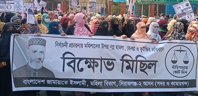 এস এম আক্কাস, সিরাজগঞ্জ: নির্বাচনী প্রচারণার সময় মহিলাদের ওপর নগ্ন হামলা, হেনস্তা ও কটূক্তির প্রতিবাদে সিরাজগঞ্জ মহিলা জামায়াতের বিক্ষোভ মিছিল অনুষ্ঠিত হয়েছে।