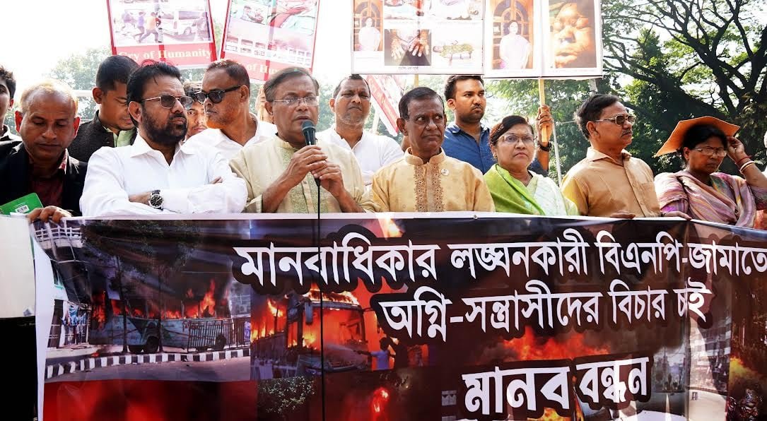 আজ রোববার রাজধানীর কেন্দ্রীয় শহীদ মিনার প্রাঙ্গণে ‘অগ্নিসন্ত্রাসের আর্তনাদ’ সংগঠন আয়োজিত ‘মানবাধিকার লংঘনকারী বিএনপি-জামায়াতের অগ্নিসন্ত্রাসী ও হুকুমদাতাদের বিচার চাই’ শীর্ষক মানববন্ধন ও সমাবেশে প্রধান অতিথির বক্তৃতায় তিনি এ সব কথা বলেন।