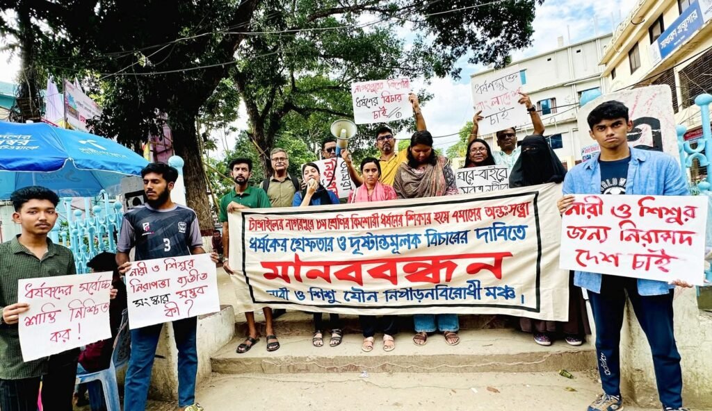 ফরমান শেখ, টাঙ্গাইল: টাঙ্গাইলের নাগরপুরে যৌন নির্যাতনের শিকার হয়ে ৮ম শ্রেণির এক কিশোরী ৭ মাসের অন্তঃসত্ত্বা হওয়ার ঘটনায় অভিযুক্ত প্রতিবেশী চাচা ফরহাদ খান (৫৫) কে গ্রেফতার করে দৃষ্টান্তমূলক শাস্তির দাবিতে মানববন্ধন কর্মসূচি পালন করা হয়েছে।