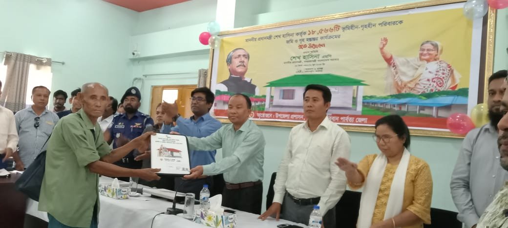থানচি (বান্দরবান) : দেশের ভূমিহীন ও গৃহহীন ১৮,৫৬৬টি পরিবারকে জমিসহ পঞ্চম দফায় প্রধানমন্ত্রী শেখ হাসিনা উপহার ঘর গৃহ হস্তান্তর কার্যক্রম শুভ উদ্বোধন করা হয়েছে। সারাদেশের ন্যায় বান্দরবানে থানচিতে ১০৫ জন গৃহহীনকে প্রধানমন্ত্রী ঘর হস্তান্তর করা হয়েছে।