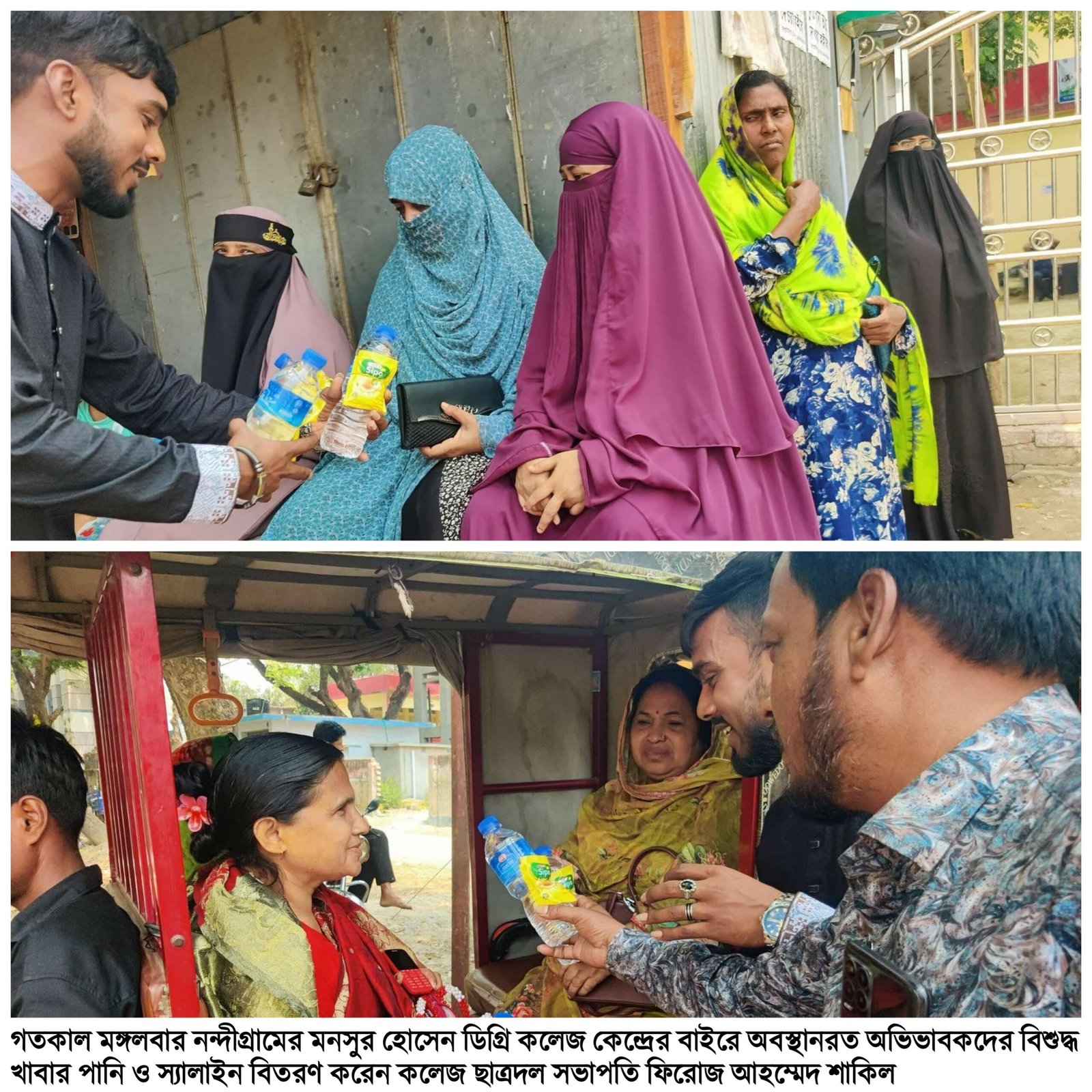 মনসুর হোসেন ডিগ্রী কলেজ ছাত্রদল সভাপতি ও উপজেলা ছাত্রদলের সহ-সাংগঠনিক সম্পাদক শাকিল বলেন, "সারাদেশের মত বগুড়ার নন্দীগ্রামে এসএসসি ও সমমানের পরীক্ষা চলমান রয়েছে। এই সময়ে পরীক্ষা চলাকালীন প্রচন্ড গরমের মাঝে পরীক্ষার্থীদের সম্মানিত অভিভাবকদের পরীক্ষা কেন্দ্রের বাইরে মারাত্মক ধকল পোহাতে হচ্ছে।তারই পরিপ্রেক্ষিতে বাংলাদেশ জাতীয়তাবাদী ছাত্রদল কেন্দ্রীয় কমিটির নেতাকর্মী,বগুড়া জেলা বিএনপির ভারপ্রাপ্ত সাধারণ সম্পাদক,সাবেক সংসদ সদস্য আলহাজ্ব মোশারফ হোসনের নিদের্শনায় ও বগুড়া জেলা ছাত্রদলের সভাপতি হাবিবুর রহমান সন্ধান ভাই-সাধারণ সম্পাদক এম.আর ইসলাম পলাশ ভাইয়ের নিদের্শনায় এবং নন্দীগ্রাম উপজেলা ছাত্রদল সভাপতি জুয়েল রানা ভাই-সম্পাদক মোস্তাফিজুর রহমান তারেক ভাইয়ের নিদের্শনায় এসএসসি পরীক্ষার্থীদের সাথে আশা আত্মীয়-স্বজন মা-বাবাদের মাঝে মাঝে খাবার স্যালাইন ও বিশুদ্ধ পানি বিতরণ করা হয়েছে।"