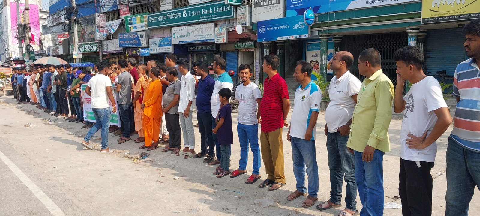নাটোরে হিন্দু ধর্মীয় আইন পরিবর্তন প্রচেষ্টার প্রতিবাদে মানববন্ধন ও বিক্ষোভ মিছিল হয়েছে। আজ শুক্রবার বিকেলে নাটোর প্রেসক্লাবের সামনে থেকে মানববন্ধন ও বিক্ষোভ মিছিল বের করা হয়। এই সময় উপস্থিত ছিলেন বাংলাদেশ জাতীয় হিন্দু মহাজোটের সভাপতি এ্যাড: ভাস্কর বাগচী, সাধারন সম্পাদক দেবাশীস কুমার সরকার, যুব মহাজোটের সভাপতি সুজিত ঘোষ,সাধারন সম্পাদক চন্দন নাথ, ছাত্র মহাজোটের সভাপতি কর্ণ তালুকদার, ইসকনের বর্মচারী নাম প্রেম সহ সংগঠনের নেতৃবৃন্দ। এই সময় বক্তারা বলেন, আমরা সনাতন ধর্মালম্বীদের যে আইন আছে আমরা সেই আইন ই চাই। আমরা তথাকথিত কোন আইন মেনে নেবো না। দেশকে অস্থীতিশীল করার জন্য নির্বাচনের আগে কিছু কুচক্র মহল হাইকোর্টে রিট করছে। তাই আমরা সরকারের কাছে আবেদন করছি সরকার যেন এই বিষয়টা সঠিক ভাবে দেখে। এ সময় মহাজোটের অন্যান্য শাখা সংগঠনের নেতৃবৃন্দরা বক্তব্য রাখেন।