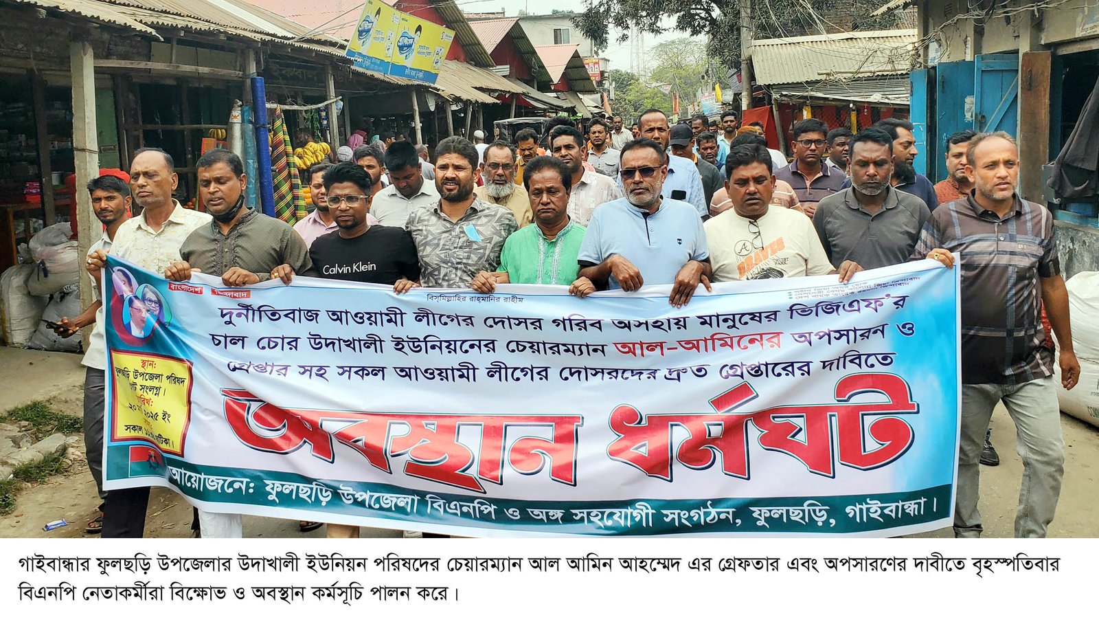 ইউপি চেয়ারম্যান ও তার সহযোগীরা নিজেদের অনিয়ম ও দুর্নীতি ঢাকতে বিএনপি নেতাকর্মীদের উপর দোষ চাপিয়ে দেন। এতে বিক্ষুদ্ধ হয়ে বিএনপি এই অবস্থান কর্মসূচি ও বিক্ষোভ মিছিল করে চেয়ারম্যানকে অপসারণ ও গ্রেফতারের দাবী জানায়। একই কর্মসূচি থেকে ফুলছড়ি থানার ওসি খন্দকার হাফিজুর রহমানের অনিয়ম ও দুর্নীতির অভিযোগ তুলে তার অপসারণও দাবী করেন নেতৃবৃন্দ। পরে বিএনপির নেতাকর্মীরা উপজেলা নির্বাহী কর্মকর্তার কাছে ইউপি চেয়ারম্যানের দুর্নীতি ও অপসারণ সংক্রান্ত স্মারকলিপি পেশ করেন।