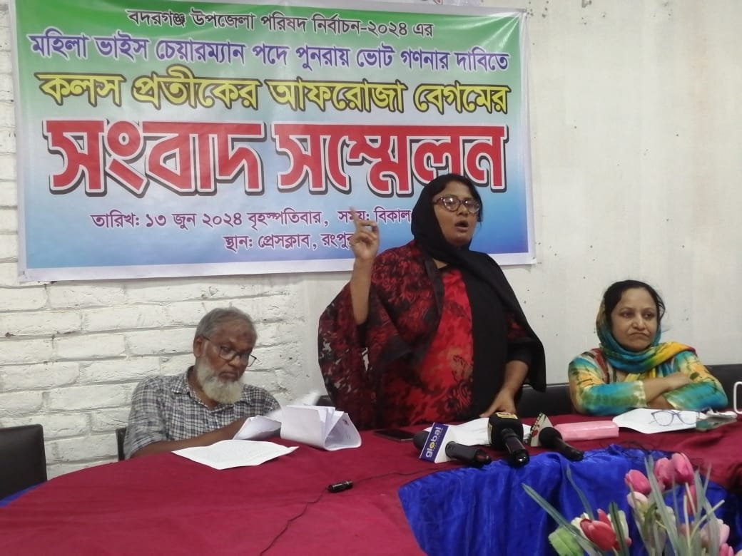 লিখিত বক্তব্যে রোকনুজ্জামান বলেন, গত ৫ জুন বদরগঞ্জ উপজেলার ১০৩টি ভোটকেন্দ্রে ভোটগ্রহণ অনুষ্ঠিত হয়। এ নির্বাচনে মহিলা ভাইস চেয়ারম্যান পদে কলস মার্কার প্রতিক নিয়ে প্রতিদ্বন্দ্বী করেছি। ভোটের পূর্বরাতে বিভিন্ন এলাকায় আমার প্রতিদ্বন্দ্বী প্রার্থী ফুটবল প্রতিকের রুবিনা আখতার টাকা বিতরণ করেছে। তার ছেলে ও স্বামী, ছাত্রলীগ নেতা দাবি করা কয়েকজনকে দিয়ে ভোটারদের হুমকি দেন। ফুটবল প্রতিকে ভোট না দিলে এলাকা ছাড়ার ভয়ভীতি দেখায়। আমি প্রশাসনকে মৌখিক ভাবে অভিযোগ করলেও কোনো ব্যবস্থা গ্রহণ করা হয়নি।