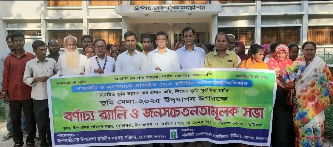 খাঁন মো. আঃ মজিদ, দিনাজপুর: দিনাজপুরের বোচাগঞ্জ উপজেলায় “নিয়মিত ভূমি উন্নয়ন কর প্রদান করি, নিজের ভূমি সুরক্ষিত রাখি” এই প্রতিপাদ্যকে সামনে রেখে কমিউনিটি ডেভেলপমেন্ট অ্যাসোসিয়েশন (সিডিএ)-এর সহযোগিতায় ভূমি মেলা ২০২৫ উদযাপন উপলক্ষে একটি র্যালি অনুষ্ঠিত হয়েছে।