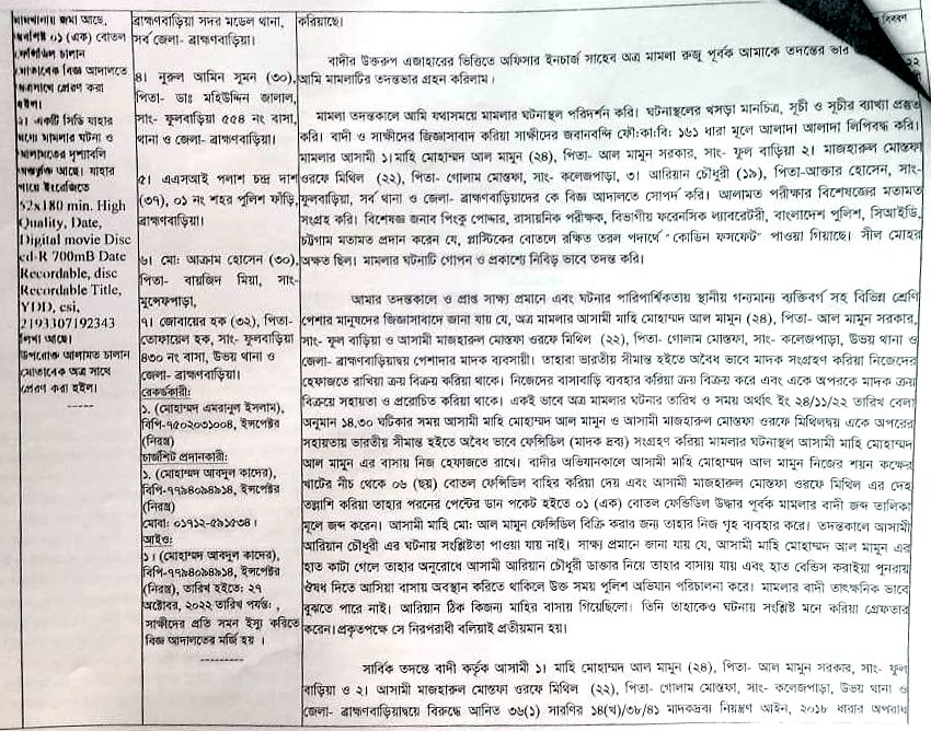 যা এখন বিচার ফাইলে রয়েছে। চার্জশিটভুক্ত আসামি মাহি মো. আল মামুন জেলা আওয়ামী লীগ সাধারণ সম্পাদক ও জেলা পরিষদ চেয়ারম্যান আল মামুন সরকারের ছেলে। অপর আসামি মাজহারুল মোস্তফা ওরফে মিথিল কলেজপাড়ার গোলাম মোস্তফার ছেলে। গত ২৪শে নভেম্বর শহরের ফুলবাড়ীয়ার নিজের বাসা থেকে মাদকসহ আটক হওয়ার পর মাহিসহ ৩ জনের বিরুদ্ধে সদর মডেল থানায় মাদকদ্রব্য নিয়ন্ত্রণ আইনে মামলা (এফআইআর নং-২৯, তারিখ:২৪/১১/২০২২) হয়।