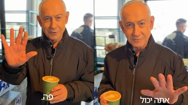 ভিডিওতে দেখা যায় জেরুসালেমের একটি কফির দোকানে এক কাপ গরম কফি হাতে তুলে নিচ্ছেন নেতানিয়াহু।