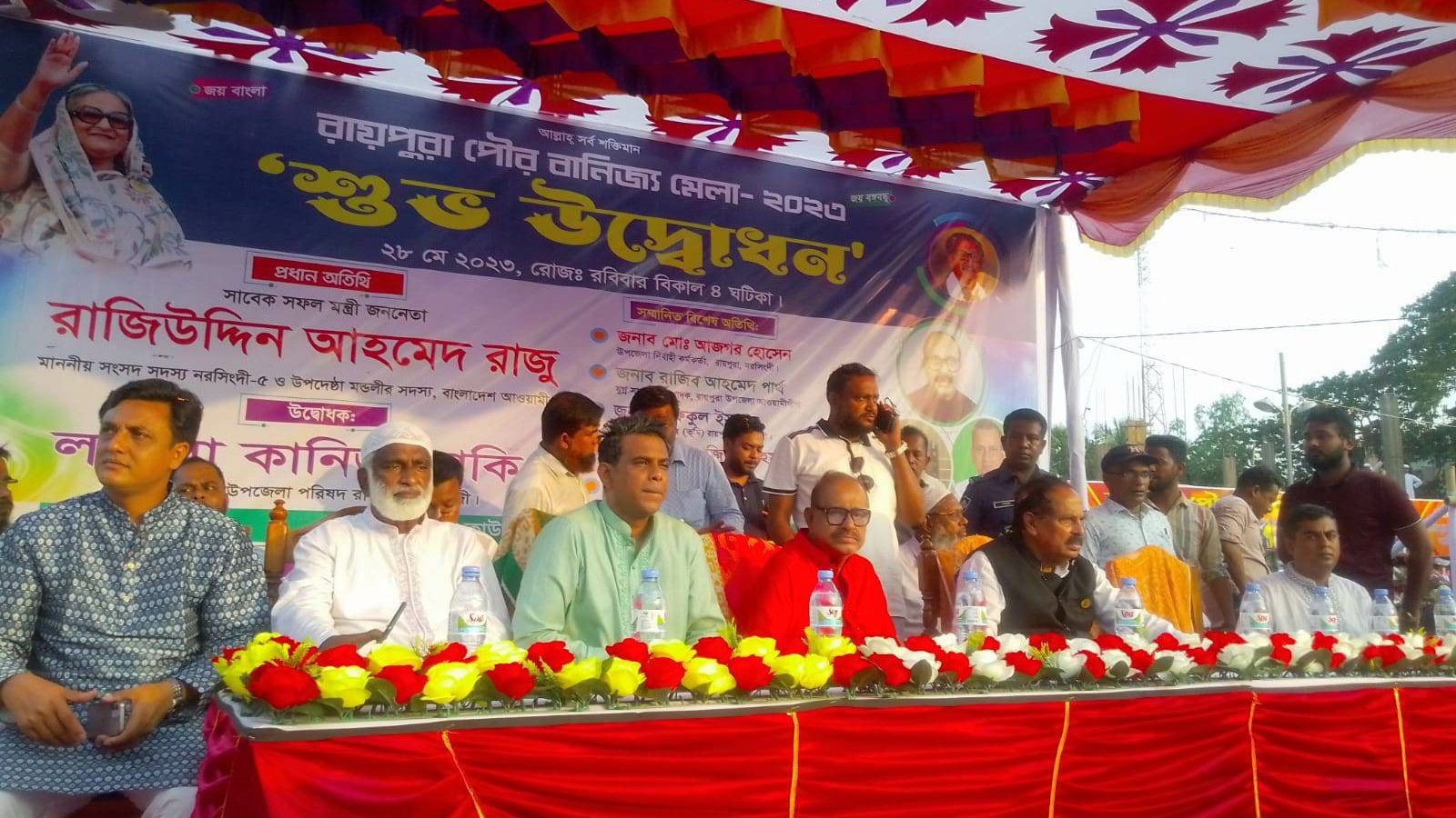 পৌর বানিজ্য মেলার শুভ উদ্বোধনে প্রধান অতিথি হিসেবে উপস্থিত ছিলেন নরসিংদী-৫ আসনে ছয় ছয়বারের সাংসদ সদস্য ও বাংলাদেশ আওয়ামীলীগের উপদেষ্টা মন্ডলীর সদস্য গণমানুষের নেতা রাজিউদ্দিন আহমেদ রাজু, নরসিংদী জেলার আওয়ামীলীগের সভাপতি জি এম তালেব হোসেন।