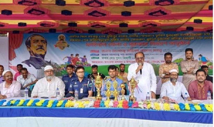 উপজেলা নির্বাহী অফিসার মোঃ সুমন জিহাদীর সভাপতিত্বে পুরস্কার বিতরণ অনুষ্ঠানে প্রধান অতিথি মজিবর রহমান মজনু এমপি বলেন, যোগ্য খেলোয়াড় হতে হলে নিয়মিত অনুশীলন করতে হবে। ভালো খেলা উপহার দিয়ে খেলার মাঠে দর্শক টানতে হবে। বিশেষ করে তরুণ যুবকদের খেলাধূলায় উদ্বুদ্ধ করতে হবে।