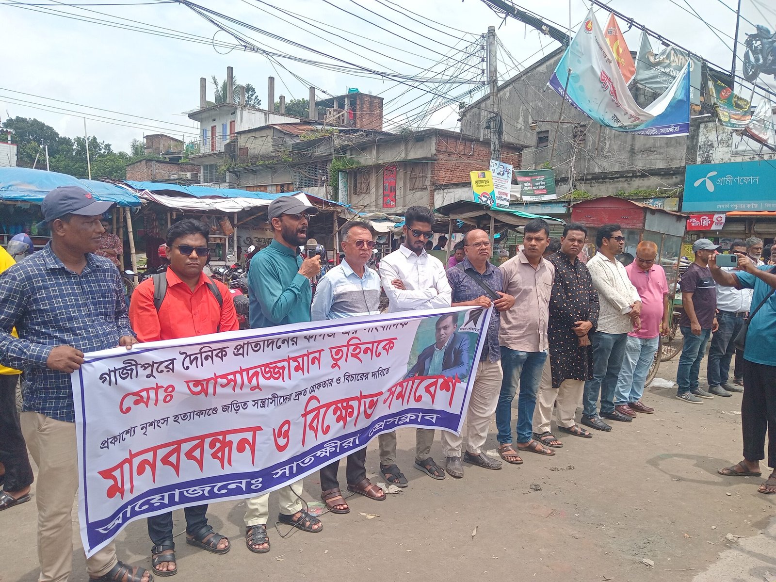 শনিবার গাজীপুরে সাংবাদিক মো. আসাদুজ্জামান তুহিনকে কুপিয়ে হত্যা করার ঘটনায় সাতক্ষীরা নিউ মার্কেট মোড়ের শহীদ স. ম. আলাউদ্দীন চত্বরে সাতক্ষীরা প্রেসক্লাবের আয়োজনে মানববন্ধন ও বিক্ষোভ সমাবেশ অনুষ্ঠিত হয়। সাতক্ষীরা প্রেসক্লাবের সভাপতি ও ইন্ডিপেন্ডেন্ট টিভির সাতক্ষীরা প্রতিনিধির আবুল কাসেমের সভাপতিত্বে এই সমাবেশে বক্তব্য রাখেন দৈনিক প্রথম আলোর নিজস্ব প্রতিবেদক কল্যাণ ব্যানার্জি, সময় টিভির মমতাজ আহমেদ বাপী, আরটিভির রামকৃষ্ণ চক্রবর্তী, দেশ টিভির শরীফুল্লাহ কায়সার সুমন, বৈষম্যবিরোধী ছাত্র আন্দোলনের নেতা ইমরান হোসেন (ইমু), সাতক্ষীরা প্রেসক্লাবের সাধারণ সম্পাদক ও বাংলাভিশনের মো. আসাদুজ্জামান, অর্থসম্পাদক ফরিদ আহমেদ ময়না, চ্যানেল টুয়েন্টিফোরের আমিনা বিলকিস ময়না, দীপ্ত টিভির রঘুনাথ খাঁসহ অনেকে।