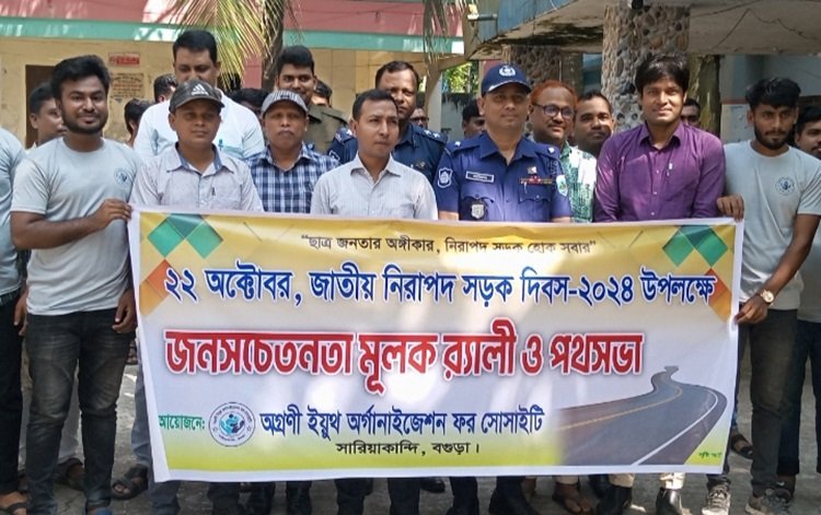 রহিদুর রহমান মিলন, সারিয়াকান্দি (বগুড়া): বগুড়ার সারিয়াকান্দিতে স্বেচ্ছাসেবী সংস্থা অগ্রণী ইয়ুথ অর্গানাইজেশন ফর সোসাইটি এর উদ্যোগে জাতীয় নিরাপদ সড়ক দিবস উপলক্ষে জনসচেতনতামূলক র‍্যালি ও পথসভা অনুষ্ঠিত হয়েছে।