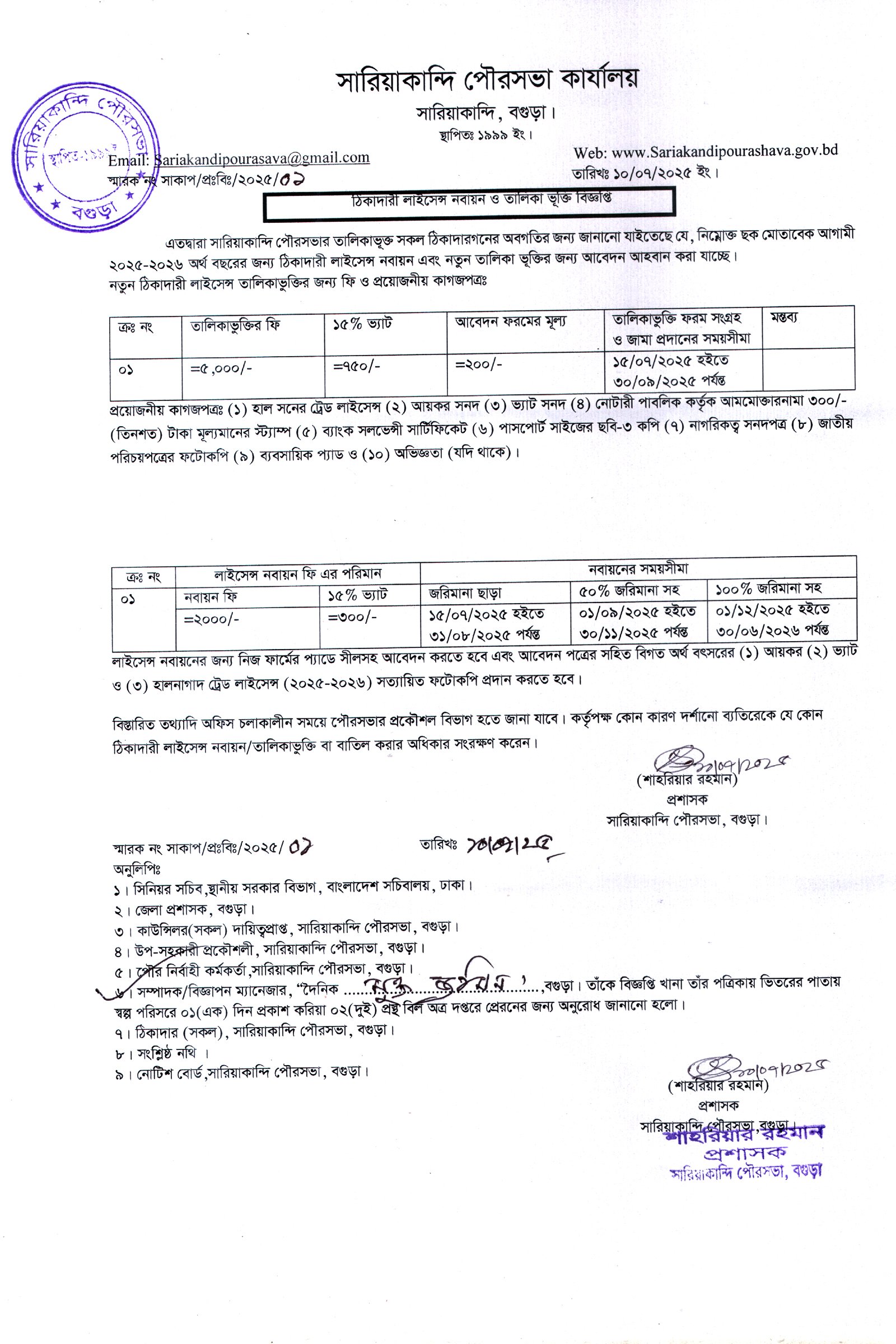 সারিয়াকান্দি পৌরসভার ঠিকাদারী লাইসেন্স নবায়ন ও তালিকাভুক্তির বিজ্ঞপ্তি