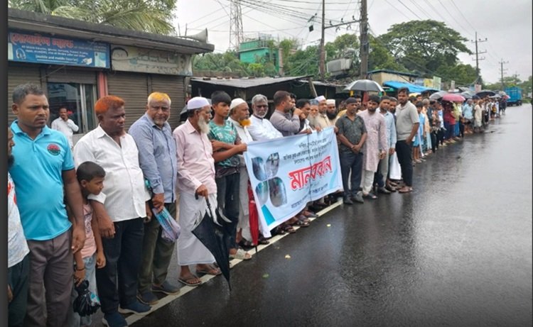 বুধবার সকাল ১১টায় ঢাকা-চট্রগ্রাম হাইওয়ে মহাসড়কে ওই মানববন্ধন অনুষ্ঠিত হয়। বৃষ্টি উপেক্ষা করে মানববন্ধনে অংশ নেন গ্রামবাসী, বিভিন্ন রাজনৈতিক দলের নেতৃবৃন্দ, মাদ্রাসার শিক্ষার্থী, মুসল্লীবৃন্দ, নারী-পুরুষসহ সর্বস্তরের জনগণ।