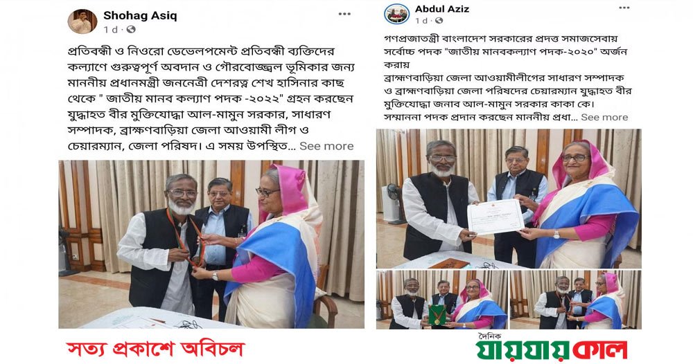 ব্রাহ্মণবাড়িয়া প্রতিনিধি: ব্রাহ্মণবাড়িয়া জেলা আওয়ামী লীগের সাধারণ সম্পাদক ও জেলা পরিষদের চেয়ারম্যান আল মামুন সরকার জাতীয় মানবকল্যাণ পদক-২০২২ পেয়েছেন। প্রায় ২ মাস আগে গত ২ জানুয়ারি তিনি সমাজকল্যাণমন্ত্রী নুরুজ্জামান আহমেদের কাছ থেকে পদকটি পান। সম্প্রতি তিনি গণভবনে প্রধানমন্ত্রীর সঙ্গে ছবি তুলে দাবি করছেন, প্রধানমন্ত্রী শেখ হাসিনার হাত থেকে তিনি এই পদক নিয়েছেন। প্রধানমন্ত্রীর সঙ্গে আল […]