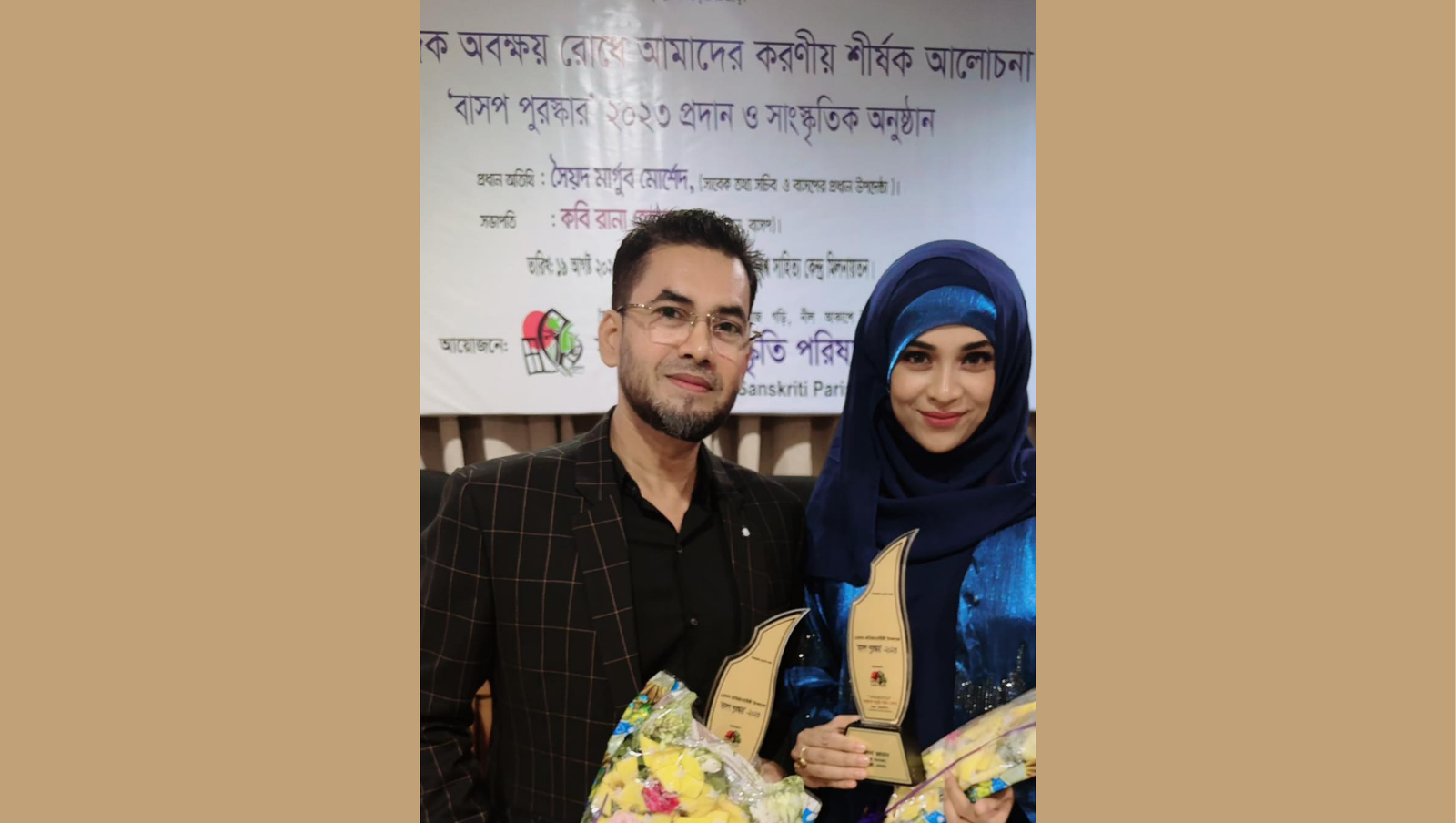 শনিবার রাজধানীর বিশ্ব সাহিত্য কেন্দ্রে বাংলাদেশ সাংস্কৃতি পরিষদ-বাসপের ২৪ তম প্রতিষ্ঠাবার্ষিকীতে আয়োজিত এক অনুষ্ঠানে এই উদ্যোক্তা দম্পতির হাতে এ সম্মাননা তুলে দেন সাবেক তথ্য সচিব সৈয়দ মার্গুব মোরশেদ।